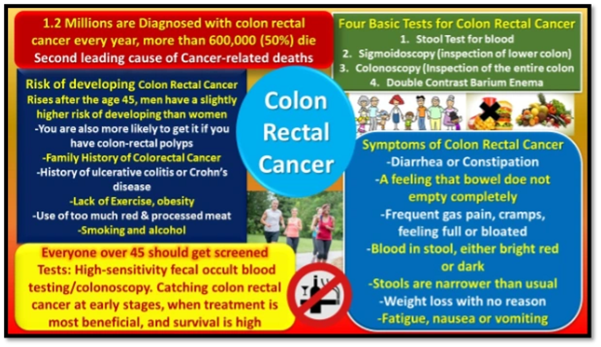 Colorectal cancer starts in the colon or the rectum. These cancers can also be called colon cancer or rectal cancer, depending on where they start. Colon cancer and rectal cancer are often grouped together because they have many features in common. Most colorectal cancers start as a growth on the inner lining of the colon or rectum. These growths are called polyps. If cancer forms in a polyp, it can grow into the wall of the colon or rectum over time. In the US during 2023, there are predicted 152,840 new cases of colorectal cancer and 52,550 deaths from colorectal cancer. The lifetime risk for developing colorectal cancer for men is 1 in 23. The lifetime risk for developing colorectal cancer for women is 1 in 26. If diagnosed early when it is localized, the survival rate for 5 years is 91%