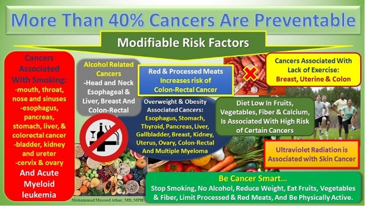 Some risk factors for cancer can be avoided, but many cannot. For example, both smoking and inheriting certain genes are risk factors for some types of cancer, but only smoking can be avoided. Regular exercise and a healthy diet may be protective factors for some types of cancer. Avoiding risk factors and increasing protective factors may lower your risk but it does not mean that you will not get cancer. Hence, appropriate age and sex related health screening is vital in detecting and preventing the cancer.